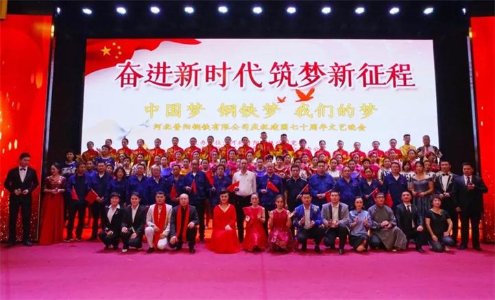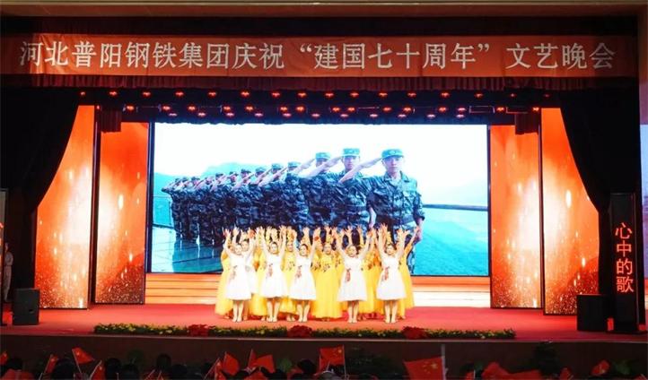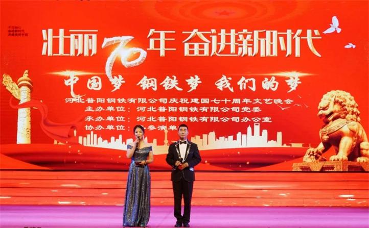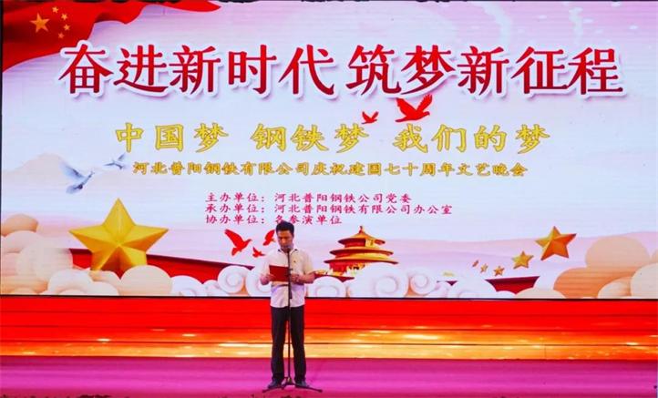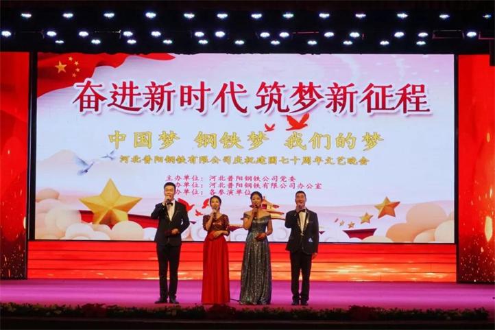 為熱烈慶祝建國70周年,河北普陽鋼鐵集團在文化中心千人禮堂舉辦“不忘初心牢記使命·中國夢鋼鐵夢我們的夢”主題晚會。陽邑鎮(zhèn)副書記楊貴寶、人大主席李國強,集團黨委書記、董事長郭恩元,副書記、總經(jīng)理石躍強,經(jīng)理會成員出席了晚會,各廠廠長、部室負責人及員工共計1000余人觀看了晚會。