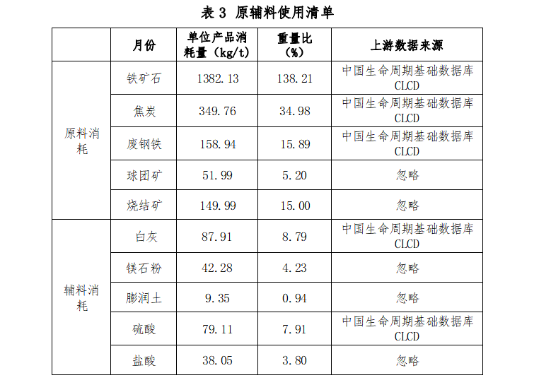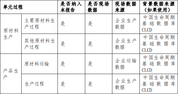 ? 本報(bào)告對(duì)系統(tǒng)邊界的所有過程進(jìn)行清單分析,包括所有能源、原材料和主要輔材的輸入,大氣、水體和固廢的排出等,部分消耗?量小于總消耗量?0.1%的輔材本報(bào)告中予以忽略?,F(xiàn)場(chǎng)數(shù)據(jù)均為本公司近?1?年內(nèi)的有效數(shù)據(jù)平均,背景數(shù)據(jù)以代表本國生產(chǎn)平均的數(shù)據(jù)優(yōu)先進(jìn)行采集。