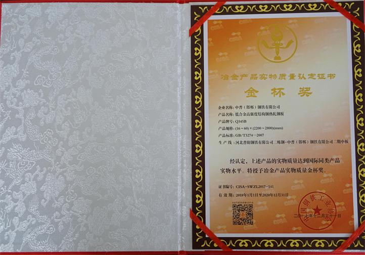 近日,由中國鋼鐵工業(yè)協(xié)會發(fā)布的2017年冶金產(chǎn)品實(shí)物質(zhì)量認(rèn)定(金杯獎)名單中,河北普陽鋼鐵有限公司二煉鋼—中普(邯鄲)鋼鐵有限公司二期中板生產(chǎn)的Q345B低合金高強(qiáng)度結(jié)構(gòu)鋼熱軋鋼板(16~60)×(2200~2800)(mm)獲此殊榮,這是2017年我公司獲得的第4個金杯獎。