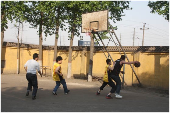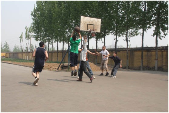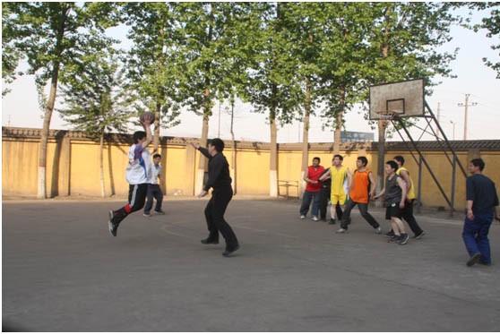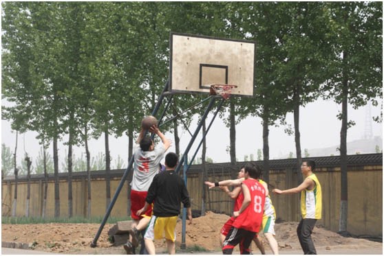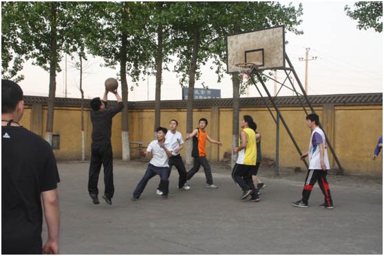 電廠隊(duì)大中鋒龍帥在籃下突破。
