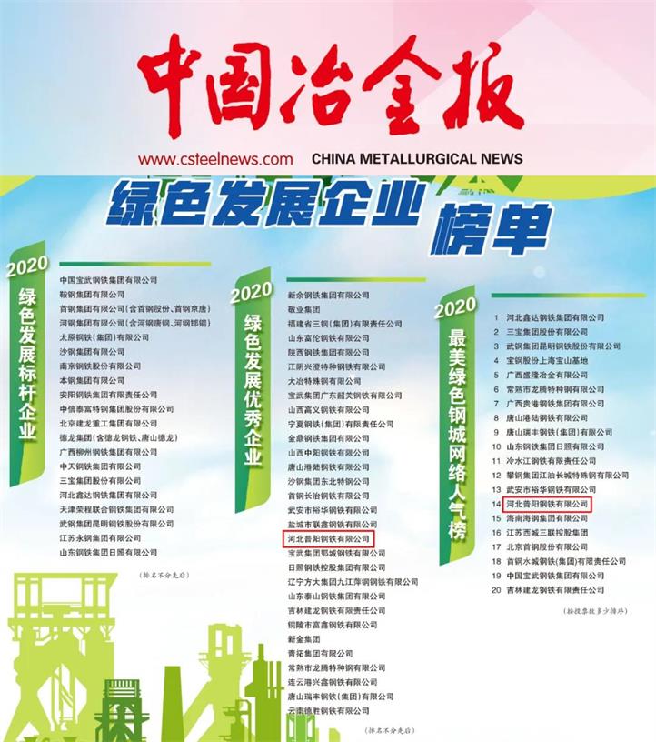世界環(huán)境日,中國冶金報(bào)社發(fā)布綠色發(fā)展企業(yè)榜單。河北普陽鋼鐵有限公司憑借卓越的環(huán)保治理社會(huì)貢獻(xiàn)力和公眾認(rèn)可度,從參評的140家國內(nèi)知名鋼企中脫穎而出,榮獲“2020年度綠色發(fā)展優(yōu)秀企業(yè)”榮譽(yù)稱號,入列“最美綠色鋼城網(wǎng)絡(luò)人氣榜”,這是普陽鋼鐵集團(tuán)去年以來連續(xù)兩次獲評“綠色發(fā)展優(yōu)秀企業(yè)”。
