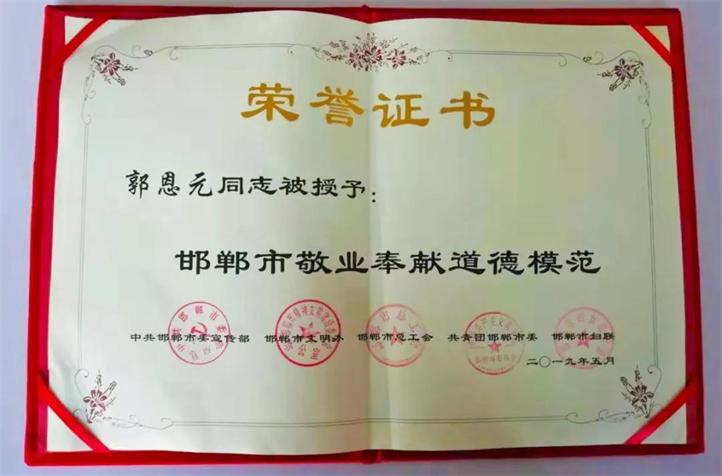 近日,由邯鄲市委宣傳部、市文明辦、市總工會(huì)、團(tuán)市委、市婦聯(lián)聯(lián)合舉辦的“邯鄲市第七屆道德模范頒獎(jiǎng)典禮暨2019年度新時(shí)代好少年先進(jìn)事跡發(fā)布會(huì)”,在市廣播電視臺(tái)演播大廳舉行。會(huì)議表彰了對(duì)推進(jìn)全市精神文明建設(shè)做出突出貢獻(xiàn)的企事業(yè)單位和個(gè)人,全國(guó)十大杰出企業(yè)家、全國(guó)鋼鐵工業(yè)勞動(dòng)模范、普陽(yáng)鋼鐵集團(tuán)黨委書(shū)記、董事長(zhǎng)郭恩元榮獲“邯鄲市敬業(yè)奉獻(xiàn)道德模范”榮譽(yù)稱號(hào)。