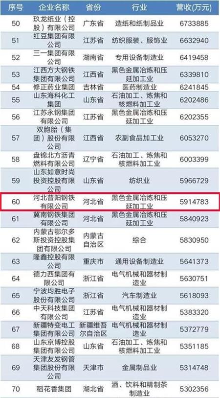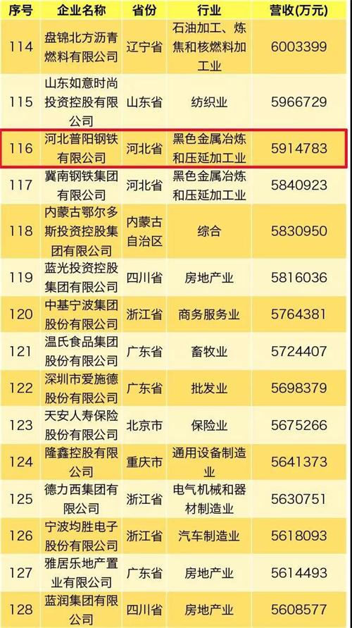 8月22日,全國工商聯(lián)在西寧發(fā)布“2019中國民營企業(yè)500強(qiáng)及民營企業(yè)制造業(yè)500強(qiáng)”榜單。河北普陽鋼鐵集團(tuán)以2018年銷售收入591.47億元,居2019中國民營企業(yè)500強(qiáng)第116位,中國民營企業(yè)制造業(yè)500強(qiáng)第60位,居武安鋼鐵之首.