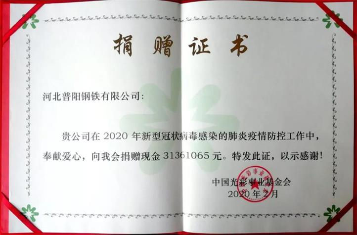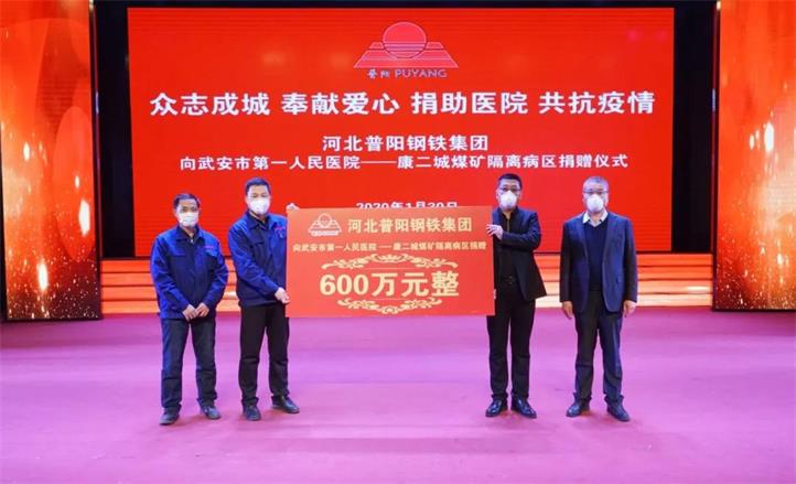 其中,通過中共武安市委統(tǒng)戰(zhàn)部和市工商聯(lián)向中國光彩基金會捐獻人民幣3136.25萬元(含員工捐款136.25萬元),定向用于武漢地區(qū)的疫情防控工作。為大力支持武安市疫情防控工作,普陽鋼鐵集團向武安市第一人民醫(yī)院(康二城煤礦隔離病區(qū))捐獻人民幣600萬元,定向用于采購必備的醫(yī)療物資。